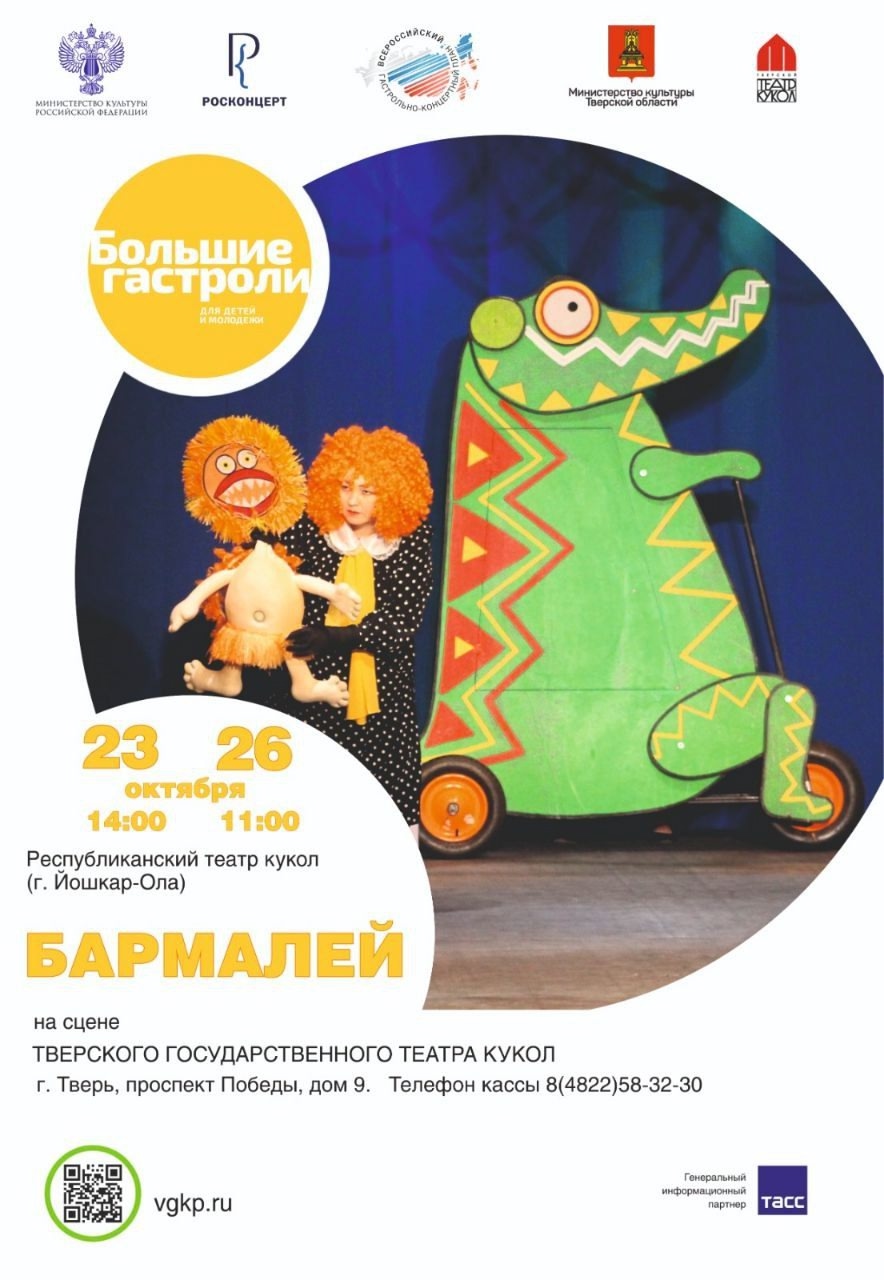 Тверской театр кукол с 23 по 26 октября примет в своих стенах коллег из Йошкар-Олы. В рамках обменных гастролей тверские зрители увидят спектакли «Бармалей» (0+), «Малыш и Карлсон» (0+) и «38 попугаев» (0+). В это же время на сцене Республиканского театра кукол в Йошкар-Оле тверская труппа покажет постановки «Маленькие большие женщины» (12+), «Котёнок по имени Гав» (0+) и «Сказка о мёртвой царевне и семи богатырях» (0+).