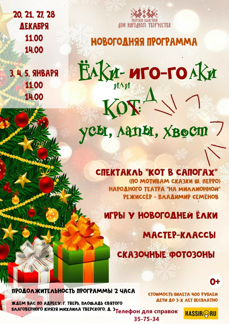 27 и 28 декабря Тверской областной Дом народного творчества (ТОДНТ) приглашает на новогоднюю программу «Ёлки-ИГО-ГОлки или КОТ(Д): усы, лапы, хвост» (0+). Маленькие зрители посмотрят спектакль «Кот в сапогах» по мотивам сказки Шарля Перо, а после смогут принять участие в представлении у новогодней елочки. Для гостей подготовлены сказочные фотозоны и увлекательные мастер-классы. Праздничная программа будет проходить в ТОДНТ и в новогодние выходные 3, 4 и 5 января.