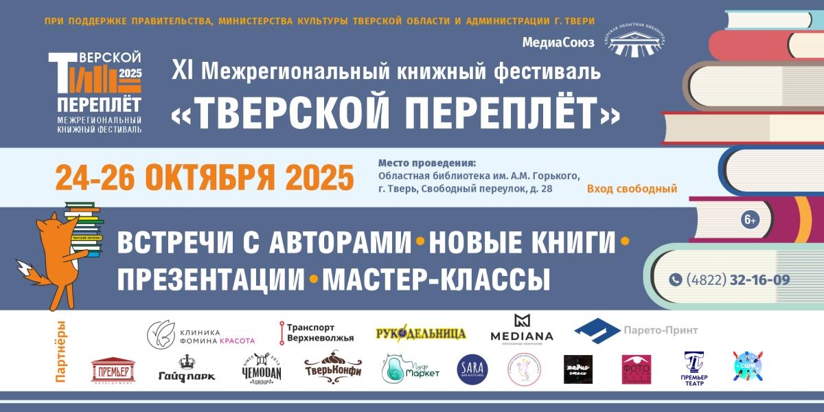 Уже сегодня в Тверской областной библиотеке имени А.М. Горького откроется ХI Межрегиональный книжный фестиваль «Тверской переплёт» (6+), который будет проходить до 26 октября и объединит ведущие отечественные издательства, писателей, представителей научного сообщества, ценителей литературы самых разных жанров. Гостей ждут презентации книг, встречи с литераторами и учёными, мастер-классы, лекции и другие активности.
