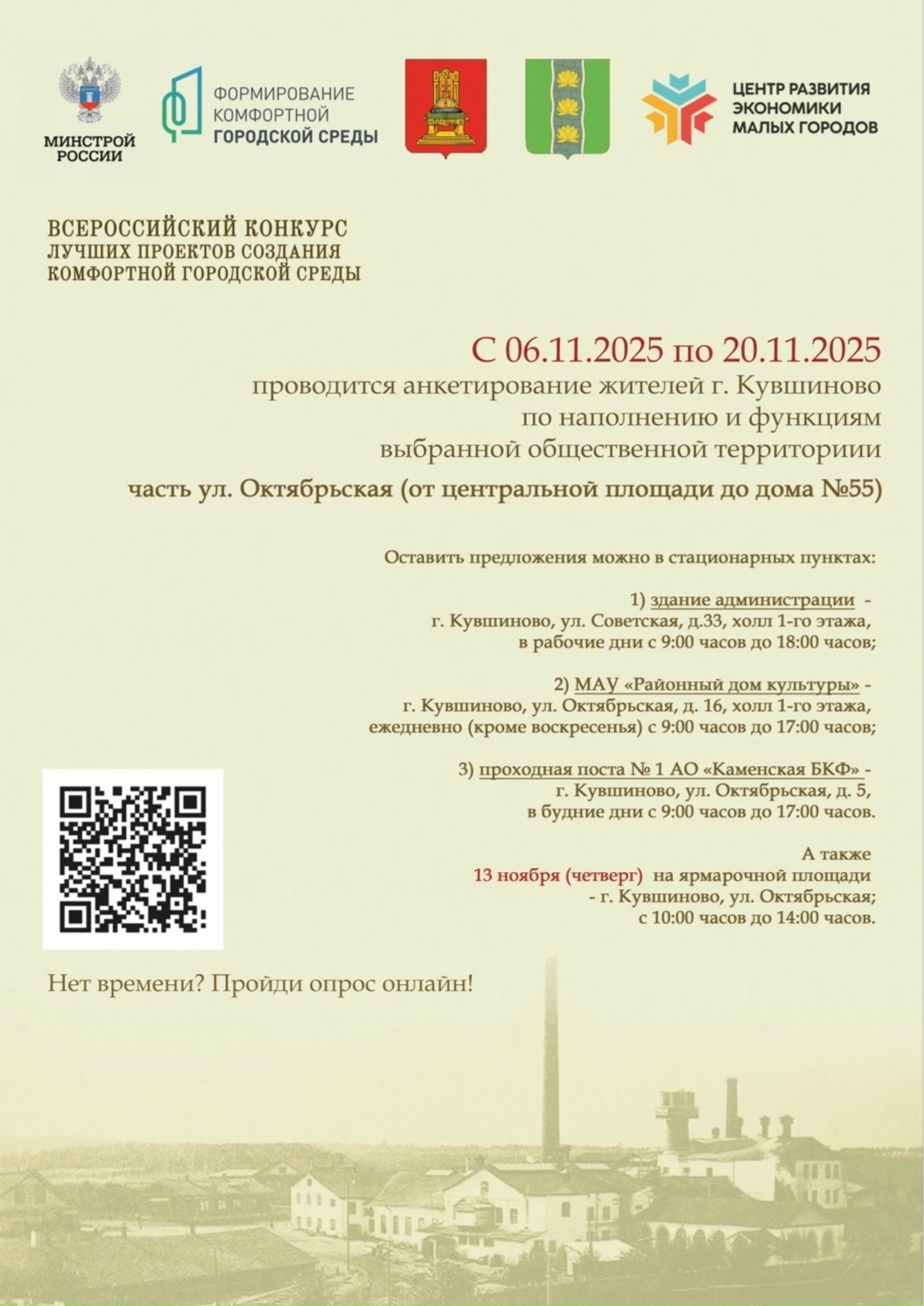 Выразить свое мнение и внести предложения можно до 20 ноября посредством электронной почты или лично подав бланк в пункты приема, расположенные в администрации Кувшиновского округа, в МАУ «Районный дом культуры», на проходной поста №1 АО «Каменская БКФ», а также в мобильный пункт приема предложений на ярмарочной площади.