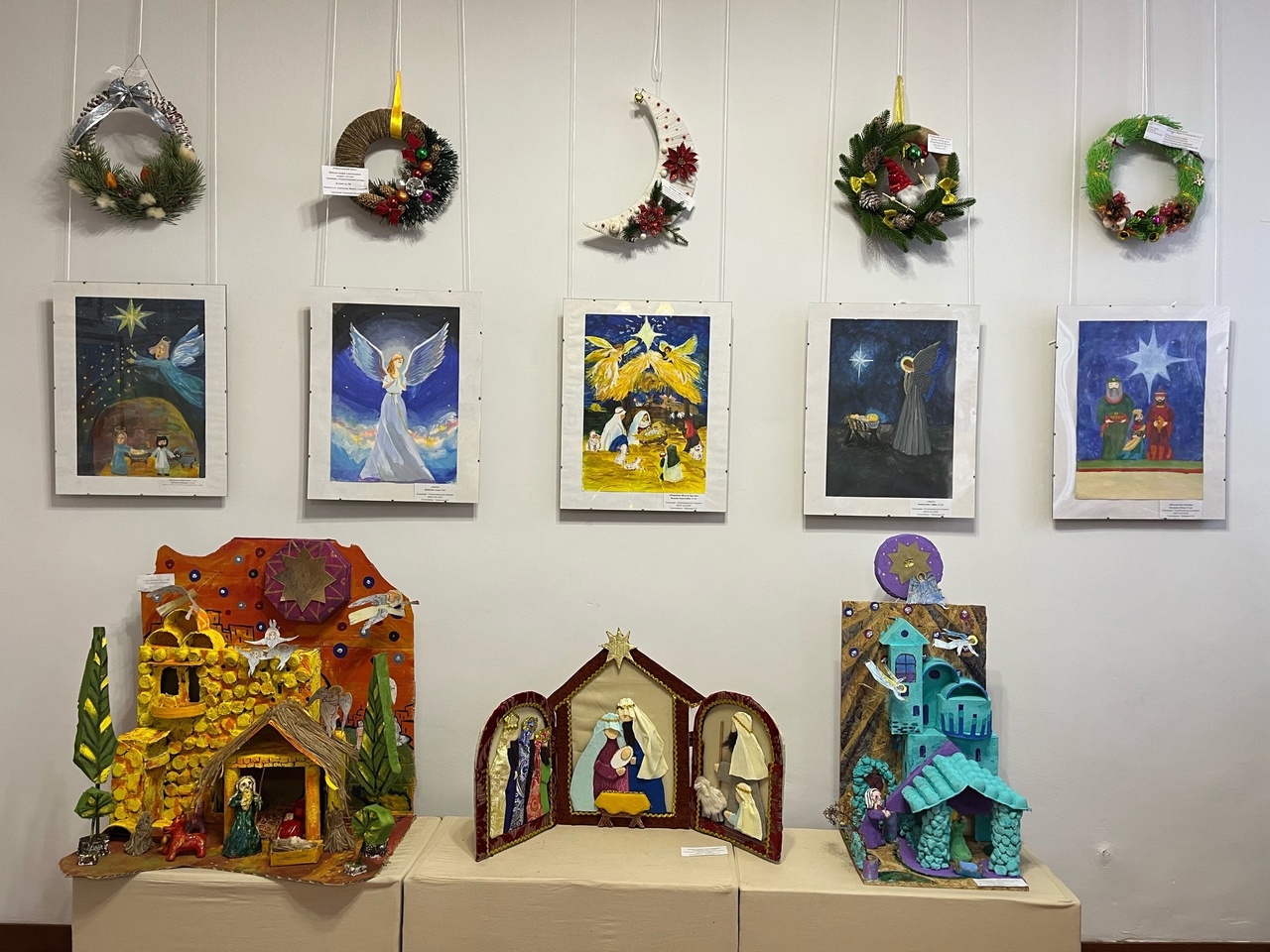 Свои творения представили дети и взрослые из посёлков Оленино и Селижарово, а также из Нелидова, Твери и Западной Двины. Тематикой экспонатов является Рождество и зимние празднования в самых разнообразных техниках изобразительного и декоративно-прикладного искусства. Участники представили рождественские вертепы, ангелов, ели, открытки, рисунки и игрушки на любой вкус.