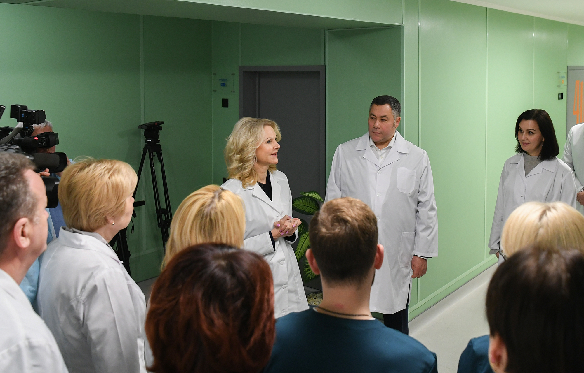 На площадке ОКБ Татьяна Голикова и Игорь Руденя провели встречу с сотрудниками медучреждения. Темами беседы стало проведение в Тверской области диспансеризации и профосмотров жителей. Для расширения охвата в регионе действуют мобильные комплексы, которые работают, в том числе в сельской местности.
