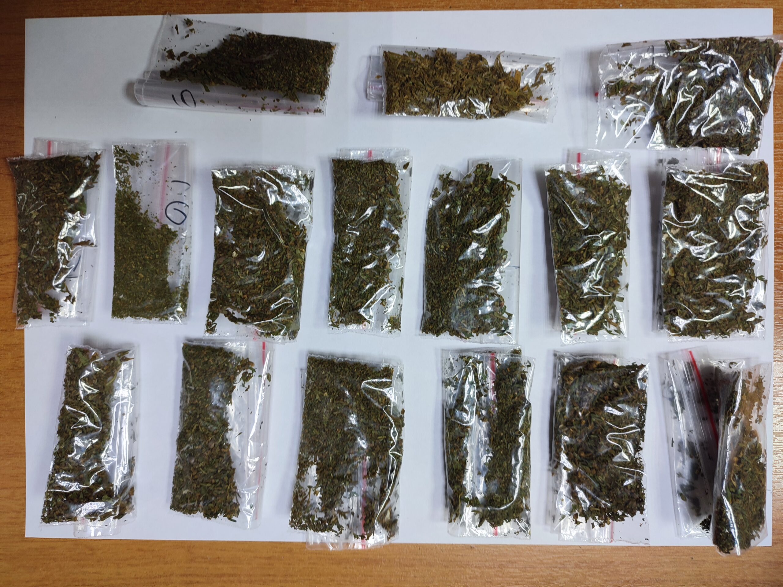 Молодого человека, подозреваемого в незаконном обороте наркотических средств, доставили в дежурную часть, где при проведении личного досмотра в его рюкзаке и в кармане куртки обнаружили и изъяли 16 свертков из фольги с содержащим внутри веществом растительного происхождения темного цвета.