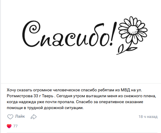 «Спасибо ребятам из МВД, вытащили меня из снежного плена, когда надежда почти пропала», — написала тверичанка. Как оказалось, в тот день полицейские помогли ещё пятерым девушкам, застрявшим в сугробах.