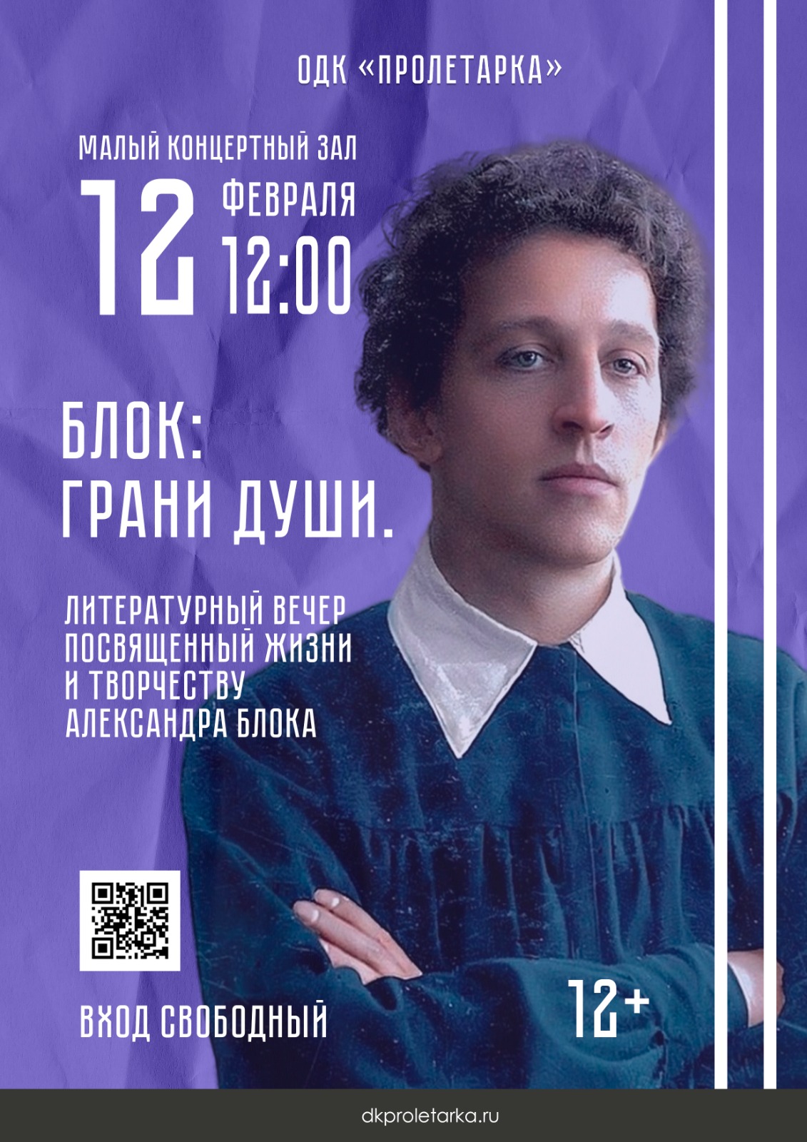 12 февраля 2025 года в 12.00 на «пролетарской» Территории Творчества пройдет литературный вечер для учащихся школ г. Тверь, где они смогут прикоснуться к таланту великого русского поэта Серебряного века, публициста, драматурга, переводчика и литературного критика — Александра Блока.