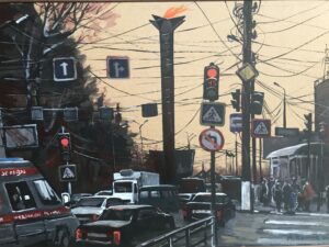 Около полутора лет назад, в одном из своих интервью, Александр отметил, что сейчас главная для него тема и источник вдохновения – город и ритмы его жизни: «Мне нравится изображать динамику, постоянное движение. Но не меньше привлекают мотивы пустынности и одиночества. Так на одних работах можно увидеть полную жизни улицу с городскими жителями, спешащими по своим бесконечным делам, на других — безжизненную архитектуру заводов, электроподстанций, безлюдные уголки города или ночные улицы с одинокими прохожими. Мне бы хотелось сделать повседневные мотивы глубокими, интересными и таинственными, чтобы каждый смотрящий осознал, что зачастую не замечает красоты вокруг себя».