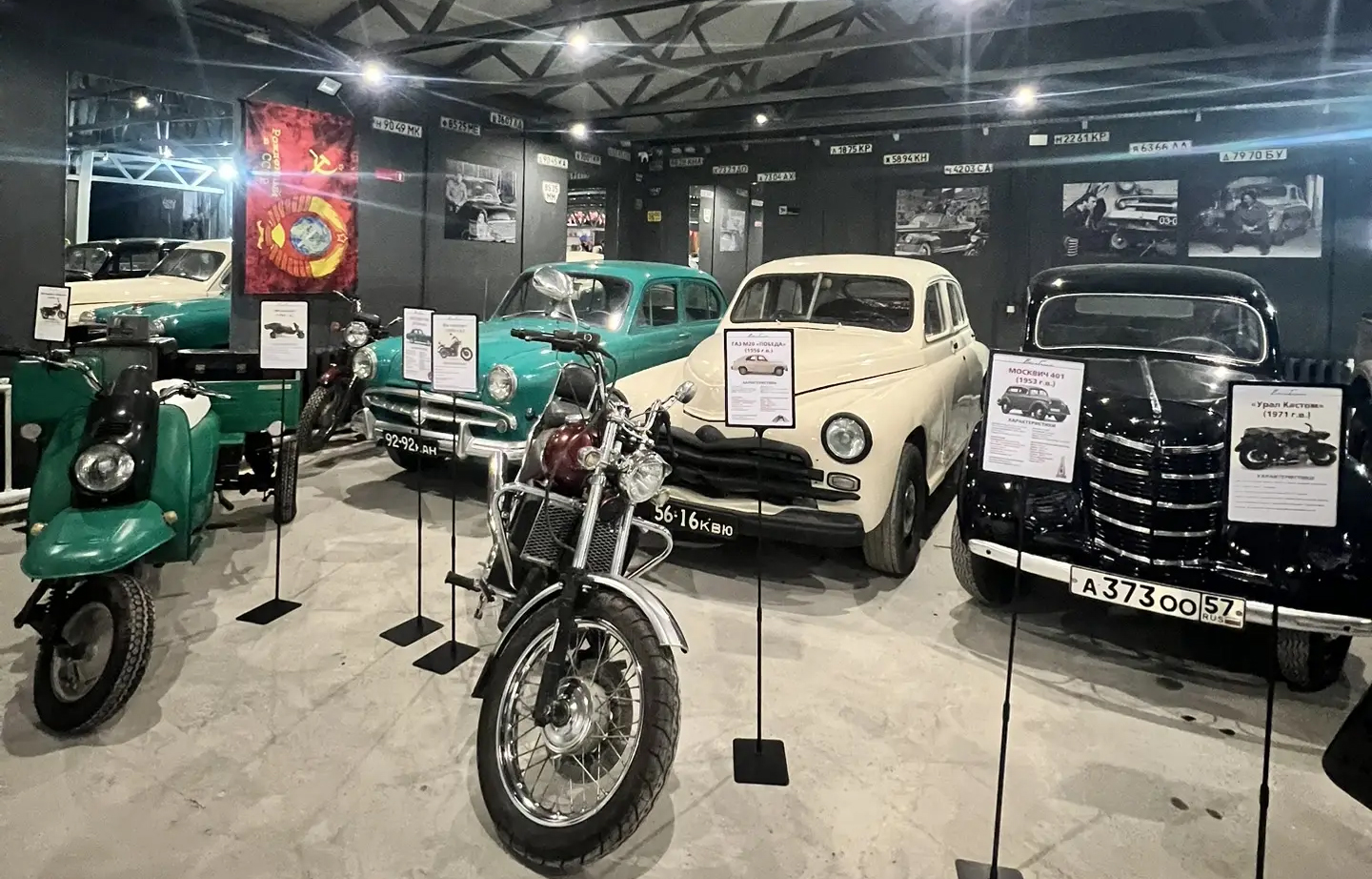 В основе экспозиции – машины и мотоциклы: легендарные «Москвич», «Волга», «Запорожец», «Урал» и «Иж». Большая коллекция мини-моделей автомобилей передана музею семьей Старшиновых из деревни Панкратово. На стеллажах расположены и другие свидетели советской эпохи: музыкальное, радио- и фотооборудование, часы, техника, книги, предметы быта.