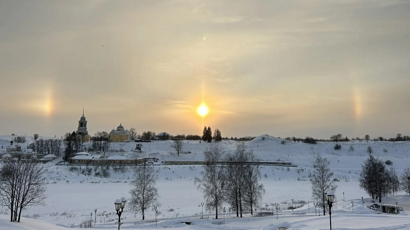 Выглядит оно так, будто светило предстало в трех лицах, да еще с радужными переливами. Чаще всего гало возникает в морозную погоду (в Старице близ Волги было -25) при повышенной влажности. В парящих микрокристаллах льда преломляются лучи Солнца, отражаясь от граней и раскладываясь на спектр. В итоге образуется световой круг. В районе Старицы полный круг был практически не виден – ярко проявились только боковые отсветы. Ученые утверждают, что это явление предшествует приходу теплого фронта.