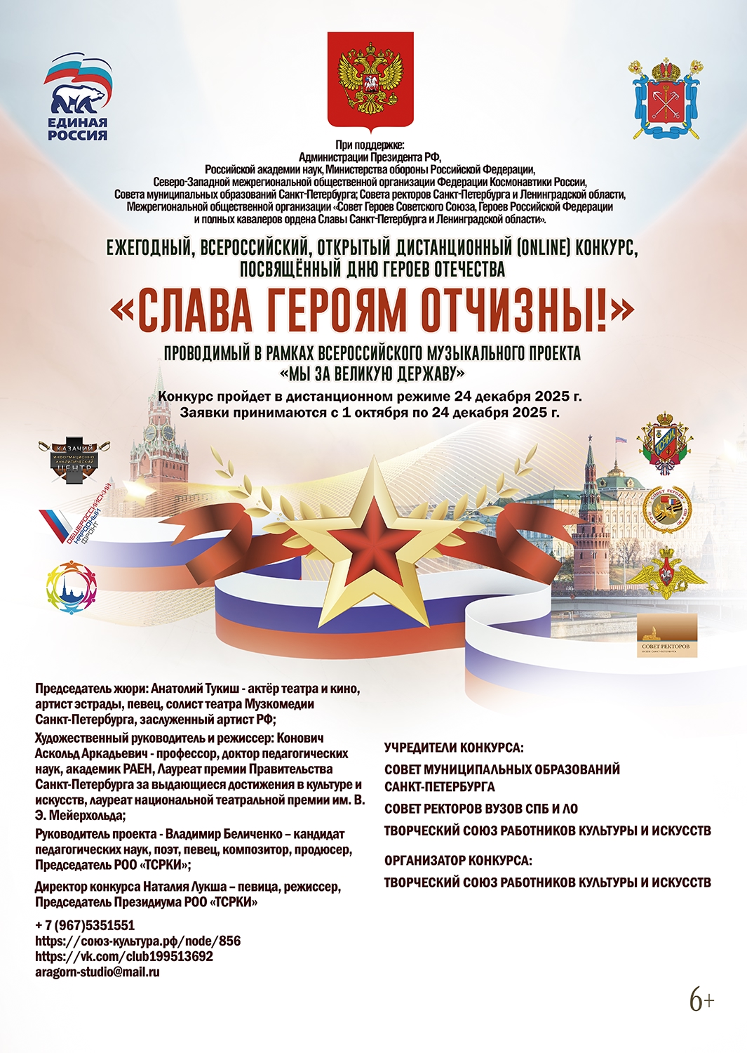 Конкурс проводится при поддержке Администрации Президента РФ, Министерства обороны РФ, Генерального Совета партии «Единая Россия», Администрации Санкт-Петербурга.