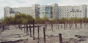 Выглядит оно как бетонный утюг или даже корабль – панельный ледокол, взрезающий окружающую зелень. С другого ракурса САБРЗ напоминает постапокалиптическую крепость, форпост выживших после конца света. Любители острых ощущений пробирались через дырки в заборе и вскарабкивались на самый верх по узкому бетонному мостику. Там открывался потрясающий вид на окрестности, но не следовало забывать о дырах в полу. Сверзиться в одну из них означало бы мгновенную смерть.